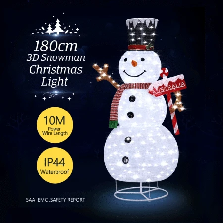 The 180CM 3D Christmas Snowman LED Light Outdoor Xmas Decorations Ornaments illuminates your home or courtyard while forming a gorgeous festive atmosphere. Featuring a robust and foldable frame, the Christmas light is durable, space-saving and convenient to transport. Available in a total height of 180cm, this outdoor Christmas light is built with 200 LED bulbs which ensure energy-saving and can serve for a long time. Waterproof and easy to set up, the Christmas LED light is ideal for both indoor and outdoor use, such as your living room, patio, backyard, garden, courtyard and doorway. For added safety and protection, this outside Christmas light is certified by SAA, EMC and safety reports.