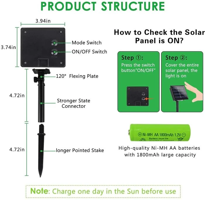 - Auto On/Off: It automatically charge at daytime and light up at night. set-in memory chip, save the last use mode automatically, no need to reset.