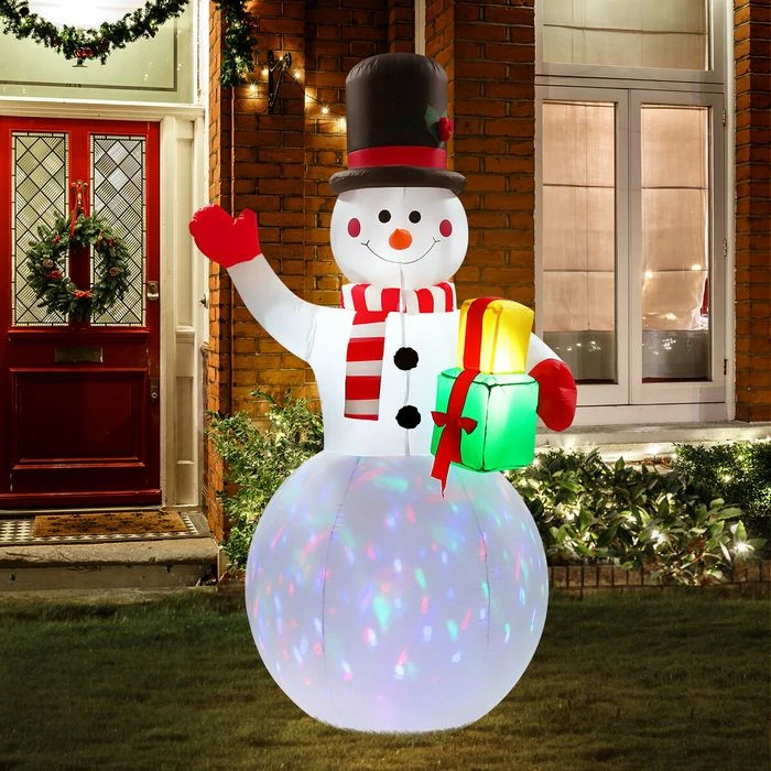 Create a winter wonderland on Christmas with this inflatable snowman that features colourful rotating LED lights. This cute inflatable Christmas snowman wears a top hat with one hand holding gift boxes and the other waving, which is the perfect way to spread holiday cheer in your neighbourhood, especially at night. Measuring 180cm in height, this inflatable snowman is suitable for not only Christmas but also parties, shopping malls, classrooms, etc. Made of high-quality polyester cloth, the blow-up snowman is weatherproof and fade-resistant, ensuring durability for continual use. Thanks to the built-in air blower, it is fast to inflate the Christmas snowman. Besides, it is easy to keep this inflatable snowman stand stably. You can fill the poly bags with water and put them inside the snowman, then fix it to the ground with the ground stakes.