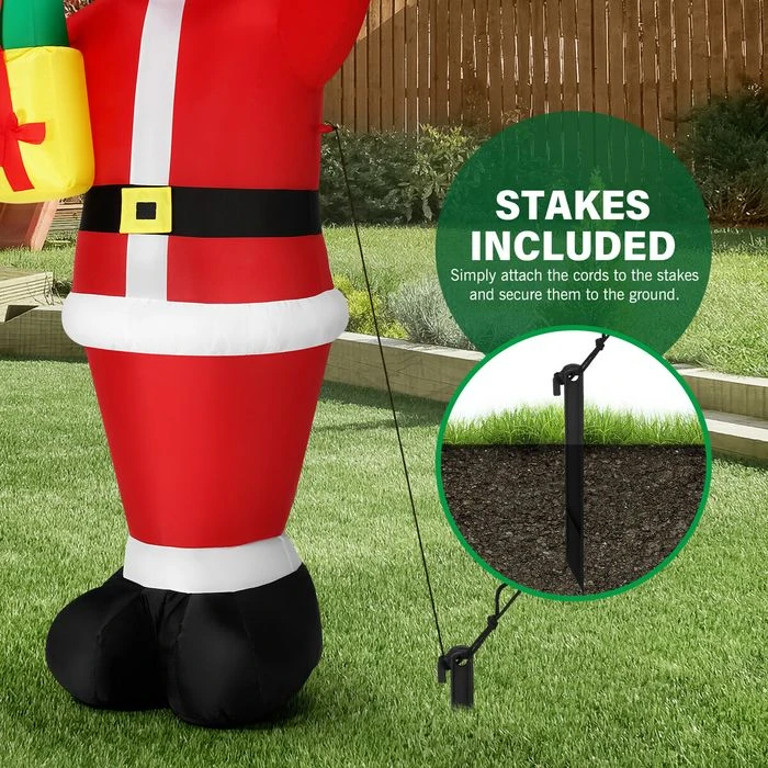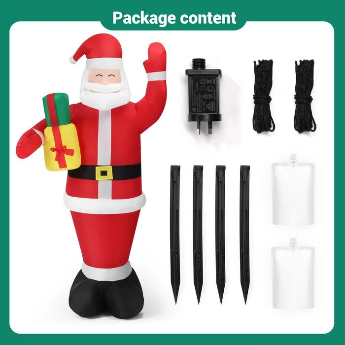 Place the Inflatable Christmas Santa Claus that features a fancy design in your courtyard or porch and spread a festive atmosphere to your neighbourhoods. Measuring 240cm in height, our Santa Claus is standing smilingly with one hand waving and the other holding a gift box. With built-in LED lights, Santa Claus will light up on Christmas night for an eye-catching view. Made of waterproof polyester that features high strength and excellent stitching, this Christmas inflatable is durable for outdoor use. Equipped with a built-in air blower for quick inflation, the Christmas decor is ready to deliver joy and cheer to your neighbours and guests. The package includes four ground stakes, two fastening ropes, and two poly bags, which can fully secure this LED Christmas decor to the ground.