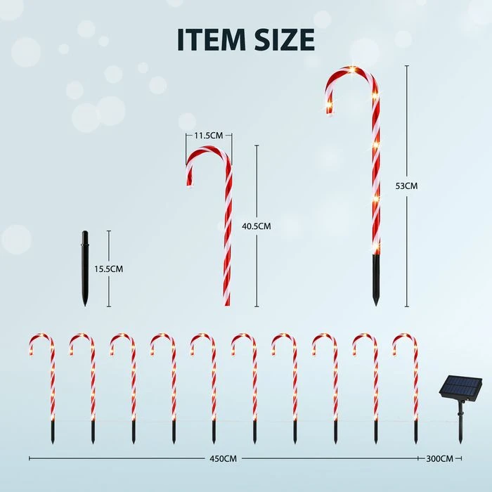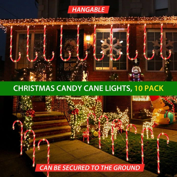 Bring festive charm to Christmas with these classic red and white candy cane lights illuminating the walkway, yard, or garden. Powered by solar energy, the lights will be charged during the day and automatically turn on at sunset. When they are fully charged, they can work for around eight hours. Made of sturdy plastic, they will safely emit light under any weather conditions. For easy installation, they come with thick plastic inserts and 6-inch ground stakes. Simply plug them into the ground, and they will illuminate the road. The LED lights feature eight functions and two lighting colours, meeting your different needs. Festive and durable, these ten candy cane lights will create a charming Christmas atmosphere.