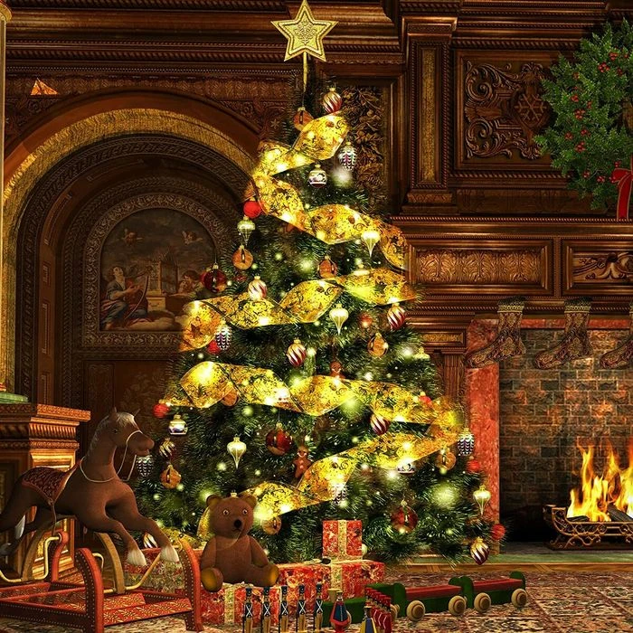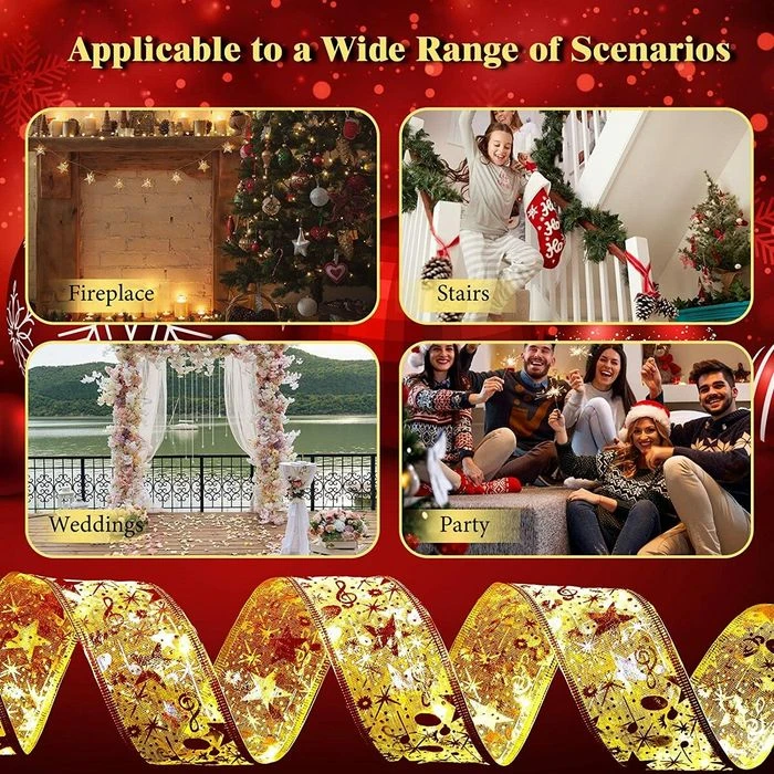 Christmas Tree Ribbon Xmas Fairy Lights, Battery Operated Decoration For Xmas Party Decorations (Gold Ribbon, Warm Yellow Light)