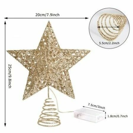 Glittered Christmas Tree Topper 25cm Metal Star Treetop 30 LED Xmas Topper Star For Christmas Tree Decoration (Gold)