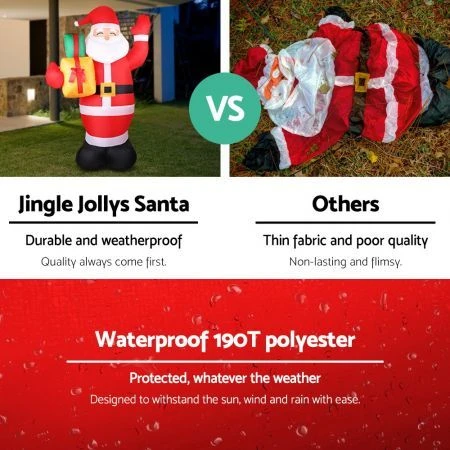 Spread some good cheer this Christmas with the Jingle Jollys 2.4m Inflatable Santa. An eye-catching and lively display that will certainly brighten up the spirit of the season. Made of UV-resistant and weatherproof 190T polyester fabric, our inflatable santa comes with great features such as three built-in LED lights for an captivating night view, a built-in fan for easy set up, and pegs and ropes to ensure Santa stands strong, firm and steady all season long. Use him in your yard or have him at the shop, our Jingle Jollys 2.4m Inflatable Santa is an outstanding d?cor near and far.
