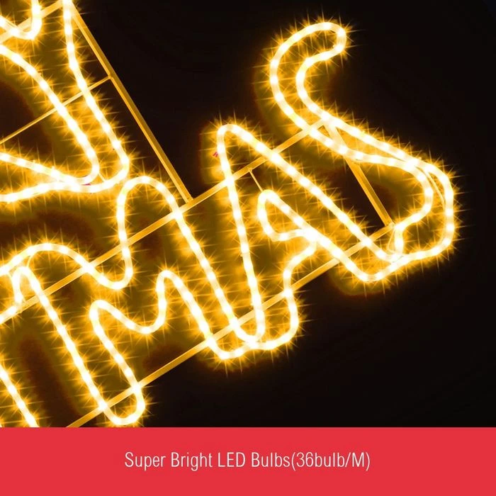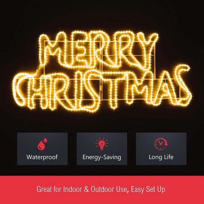 Add a festive and sparkling glamour to your home or garden with this Merry Christmas LED Rope Light. Designed in size of 190cmx80cm and built with 36 bright LED bulbs, the Xmas light is engineered with a heavy-duty steel frame for maximum durability and stability. Furthermore, it illuminates a steady and soft glow while lasting long, saving energy and ensuring safety during the Christmas season. This Christmas light comes with a 10-meter long cable and a low voltage transformer for your convenience and ease of use. SAA approved, the LED string light is safe for indoor and outdoor use to decorate walls, fences, balconies, roofs, patios, pillars, stairs and Xmas trees.