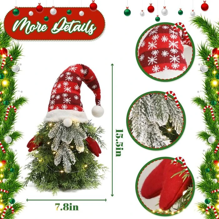 Christmas Gnome Tree: This mini Christmas gnome tree uses simulation technology to beautifully simulate the appearance of a Christmas gnome. The size is 8*8*13 inches. The gnome tree is handmade, and the gnome’s face peeks out from the greenery with a unique hat and vivid greenery, which looks super cute.