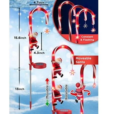 Christmas cane lights with unique Santa Claus and Snowflowers design. Santa Claus can rotate and slide up and down, you can adjust to different positions according to your needs. The Snowflowers lights have two modes of constant and flashing to meet your different party scenes and Christmas decoration styles.