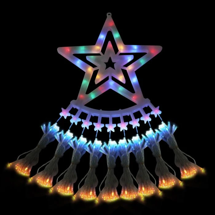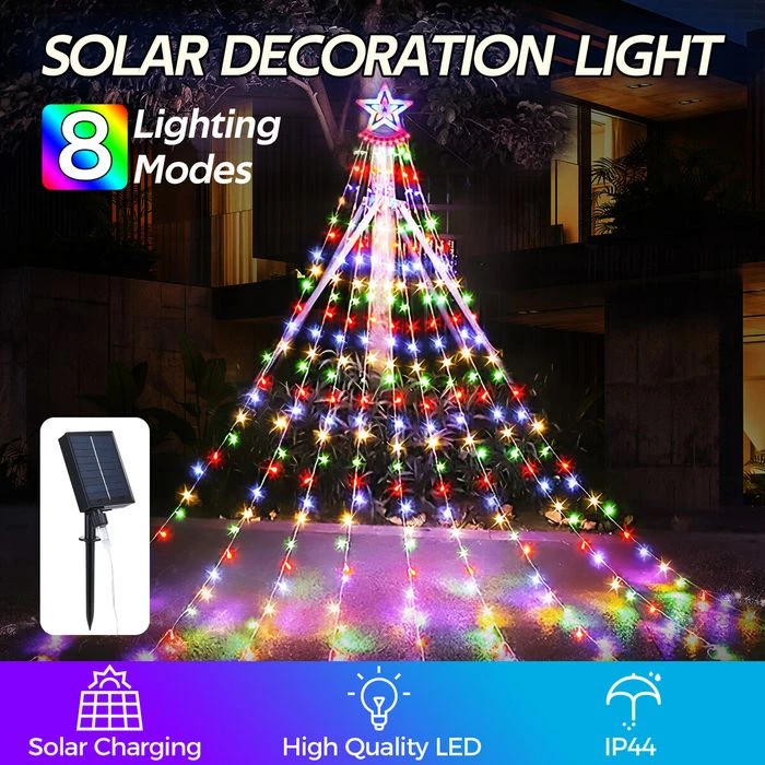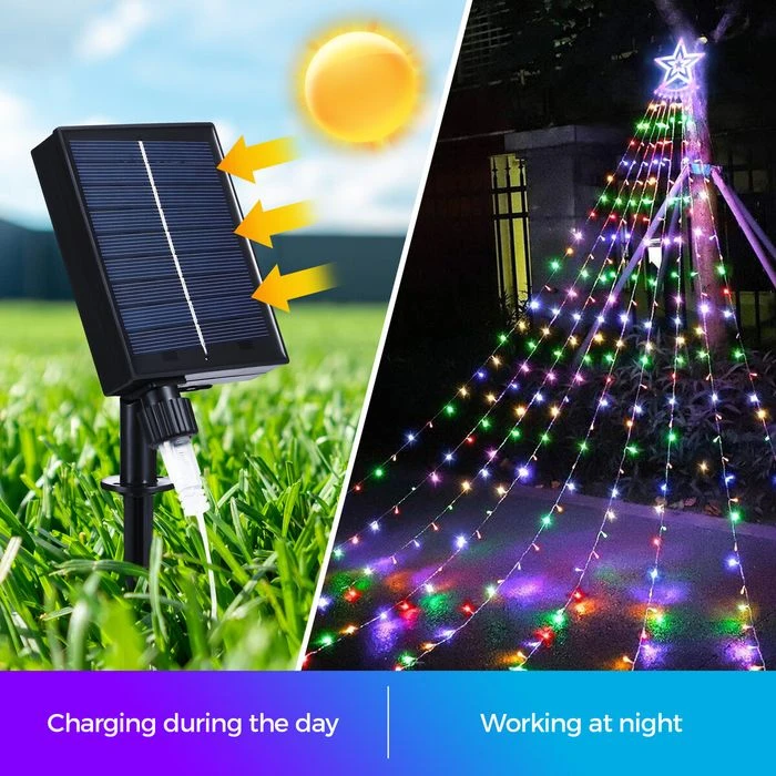 Celebrate the holiday season and enhance festive enjoyment by using this Solar LED String Light Fairy Waterfall Christmas Tree Decoration Ornament. It is a fabulous lighting piece combined with a star topper and 9 strands of lights. The built-in 350 LEDs have a long lifespan, consume less energy and create a multi-colour lighting effect. The construction of PVC and epoxy resin contributes to hard-wearing durability and maximum safety. The solar led light also has eight distinct lighting settings to accommodate your various needs. Suitable for indoor and outdoor use, the solar string lights can be used for Christmas tree decoration, weddings, engagements, parties, etc.