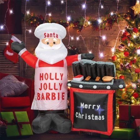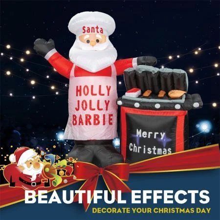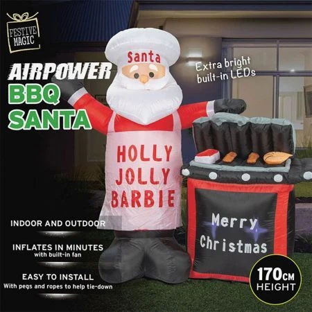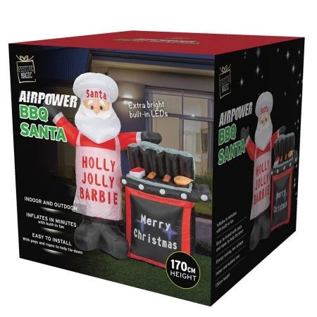 Christmas 1.7M Inflatable BBQ Santa Claus At 1.7 metres tall, this cheery Santa and his barbecue set will put a smile on your face every day of the Christmas season. The whole structure inflates in 2-3 minutes and it also comes with its own built-in fan so you don’t have to worry about constantly pumping air to keep its shape. Super-bright cool-white LED lights make the structure stand-out during the night. A 5m black lead cable plus pegs and ropes for tie-down are included, and Santa deflates quickly thanks to zippers for fast release. It folds up easily and doesn’t take up much storage space so you can keep it safe all-year round until you need some Christmas cheer. This inflatable has SAA approval and ERAC registration, so it’s safe for indoor and outdoor use and you will have peace of mind knowing it’s made of the right stuff. In addition to a hassle-free set-up, it also comes with an extra low voltage transformer that helps regulate power while your inflatable is being used. This product is in stock and ready for fast shipping from our Australian warehouse. You won’t find a better price!