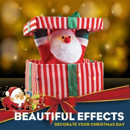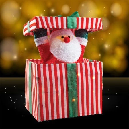 Fitted with 18 LED lights, it has a steady glow to keep your display looking fresh and exciting. Santa is 30cm tall, making it perfect for both your house facade (as long as it is undercover) or inside your home. Santa pops up and down out of the present at a steady speed. A 5m transparent lead cable is included in the box.