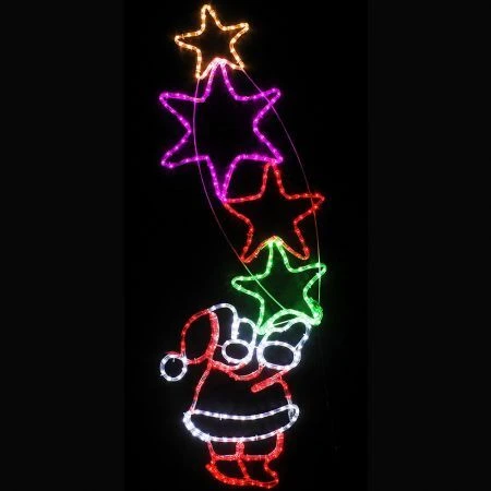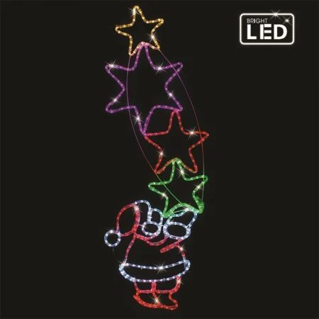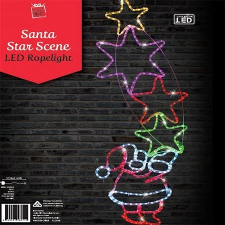 Consisting of Santa holding up different coloured stars, the display reaches 1.4m tall and 49cms long. It has 36 LEDs per metre and can be used on your house exterior or to brighten up inside your home. You can set and forget your light show or easily switch between different flashing effects or a steady effect. The wiring is covered in a sleek clear material that holds each individual bulb in place for a stunning look. A 5m black lead cable is included in the box and a steel metal frame holding everything together makes for easy set-up. This rope light has SAA approval and ERAC registration, so it’s safe for indoor and outdoor use and you will have peace of mind knowing it’s made of the right stuff. In addition to a hassle-free set-up, it also comes with an extra low voltage transformer that helps regulate power while your light is being used. This product is in stock and ready for fast shipping from our Australian warehouse. You won’t find a better price!